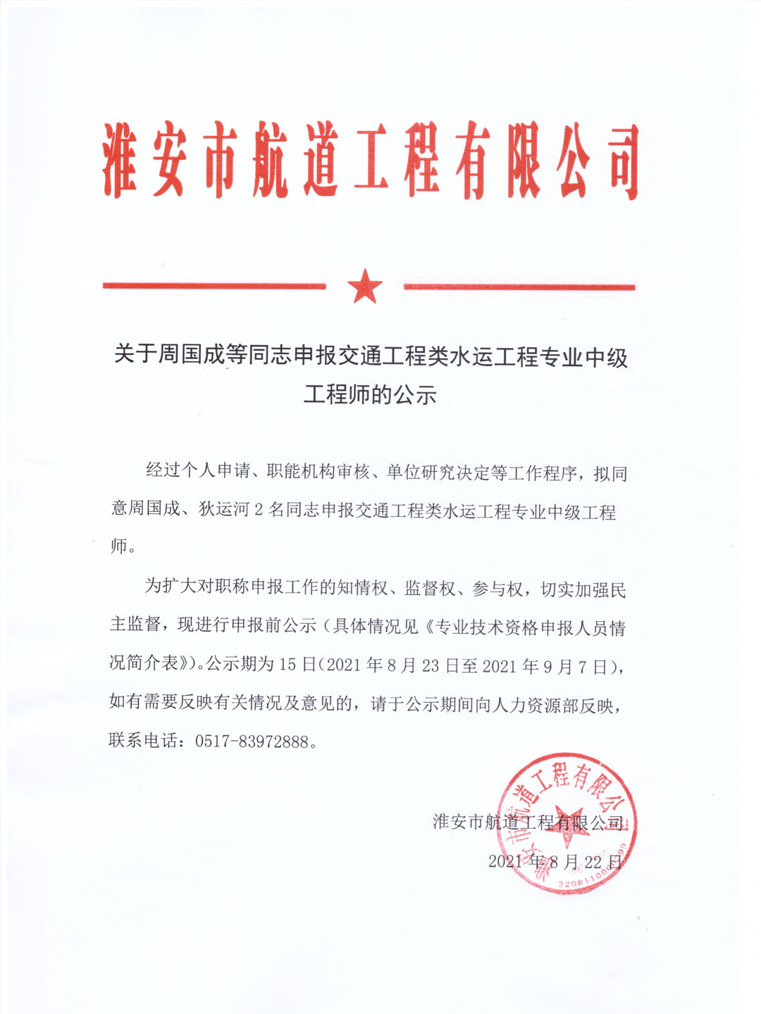 關(guān)于金曉雷、孫智林兩名同志申報(bào)交通工程類水運(yùn)工程專業(yè)工程師的公示
