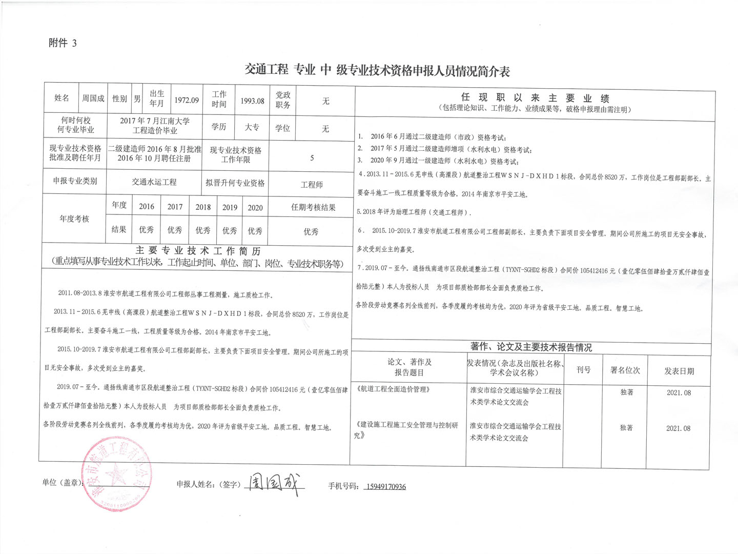 關(guān)于周國成等同志申報(bào)交通工程類水運(yùn)工程專業(yè)中級工程師的公示